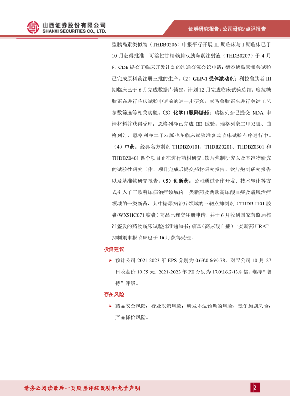 多款产品获批上市,研发项目加速推进。公司持续加大研发投入,前三季度同比增长高达 56.88%。多款产品步入收获期,首款口服降糖药磷酸西格列汀于 9 月获批上市,门冬胰岛素注射液及西格列汀二甲双胍片(Ⅱ)于 10 月同时注册获批。其他产品方面: (1)胰岛素类似物:门冬胰岛素 30 与门冬胰岛素 50 已于 6 月提交上市申请,7 月获得受理;赖脯胰岛素注射液 25R、赖脯胰岛素注射液 50R 已进入临床试验;超速效型胰岛素类似物(THDB0206)申报平行开展 III 期临床与 I 期临床已于10 月获得批准;可溶性甘精赖脯双胰岛素注射液(THDB0207)于 4 月向 CDE 提交了临床开发计划的沟通交流会议申请;德谷胰岛素相关试验已完成原料药注册三批的生产。(2)GLP-1 受体激动剂:利拉鲁肽者 III期临床已于 6 月完成数据库锁定,计划 12 月完成临床试验总结; 度拉糖肽正在进行临床试验申请前的进一步研究;索马鲁肽正在进行关键工艺参数筛选等相关实验。 (3)化学口服降糖药:瑞格列奈已提交 NDA 申请材料并获得受理;恩格列净已完成 BE 试验;瑞格列奈二甲双胍、曲格列汀、恩格列净二甲双胍也在临床试验准备或临床试验有序进行中。(4)中药:经典名方制剂 THDBZ0101、THDBZ0201、THDBZ0301 和THDBZ0401 四个项目正在进行药材研究、饮片炮制研究以及基准物研究的试验性研究工作,项目完成后提交药材研究报告、饮片炮制研究报告以及基准物研究报告。 (5)创新药:公司通过合作开发、技术转让等方式引入了三款糖尿病治疗领域的一类新药及两款高尿酸血症及痛风治疗领域的一类新药,其中糖尿病治疗领域的三靶点抑制剂(THDBH101 胶囊/WXSHC071 胶囊)药品已递交注册申请,并于 6 月收到国家药监局核准签发的药物临床试验批准通知书; 痛风(高尿酸血症)一类新药 URAT1抑制剂申报临床也于 10 月获得受理。