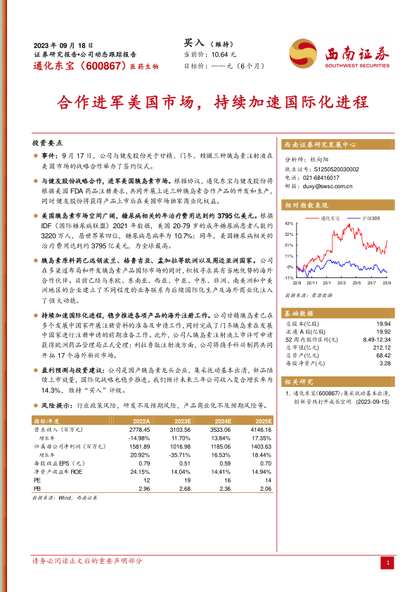 盈利预测与投资建议:公司是国产胰岛素龙头企业,集采扰动基本出清,新品陆续上市放量,国际化战略也稳步推进。我们预计未来三年公司收入复合增长率为14.3%,维持“买入”评级。