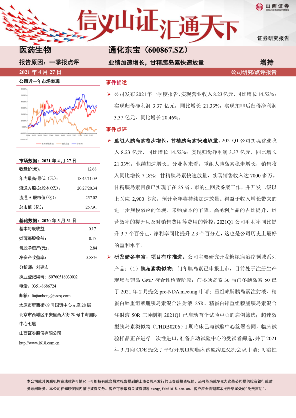 本报告对通化东宝2021年一季度业绩进行了分析,指出公司业绩加速增长主要受益于重组人胰岛素的稳步增长和甘精胰岛素的快速放量,以及公司盈利能力的提升。同时,公司在糖尿病治疗领域拥有丰富的研发储备,多个项目有序推进,为未来增长奠定基础。报告给予公司“增持”评级,并提示了相关风险。