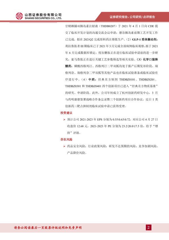 研发储备丰富,项目有序推进。公司主要研究开发糖尿病治疗领域系列产品: (1)胰岛素类似物:门冬胰岛素已申报上市,目前处于注册生产现场与药品 GMP 符合性检查阶段;门冬胰岛素 30 与门冬胰岛素 50 已于 2021 年 2 月提交 pre-NDA meeting 申请;重组赖脯胰岛素注射液、精蛋白锌重组赖脯胰岛素混合注射液 25R、精蛋白锌重组赖脯胰岛素混合注射液 50R 三种制剂 2021Q1 已启动首个试验中心的病例筛选;超速效型胰岛素类似物(THDB0206)I 期临床已与试验中心签署合同,临床试验样品正在进行一次性进口, 准备启动试验中心的受试者筛选,并于 2021年 3 月向 CDE 提交了平行开展Ⅲ期临床试验沟通交流会议申请; 可溶性甘精赖脯双胰岛素注射液(THDB0207)于 2021 年 4 月 1 日向 CDE 提交了临床开发计划的沟通交流会议申请;德谷胰岛素前期工艺开发工作已完成,拟在 2021Q2 完成原料药注册批生产。 (2)GLP-1 受体激动剂:利拉鲁肽者 III 期临床已于 2021 年 3 月完成全部病例临床观察,拟于 2021年 6 月完成数据库锁定;度拉糖肽正在进行临床试验申请前的进一步研究;索马鲁肽正在进行关键工艺参数筛选等相关实验。 (3)化学口服降糖药:磷酸西格列汀、西格列汀二甲双胍均处于报产后期发补阶段,瑞格列奈、瑞格列奈二甲双胍等其他产品也在临床试验准备或临床试验有序进行中。 (4 )中药:经典名方制剂 THDBZ0101 、THDBZ0201 、THDBZ0301 和 THDBZ0401 四个创新项目已进入“经典名方物质基准”的研究、申请阶段。此外,公司年初成立了杭州创新药研发中心,3 月与药明康德签署战略合作备忘录暨三个创新药项目合作协议,近日 I 类创新药三靶点抑制剂临床试验申请已获得受理。