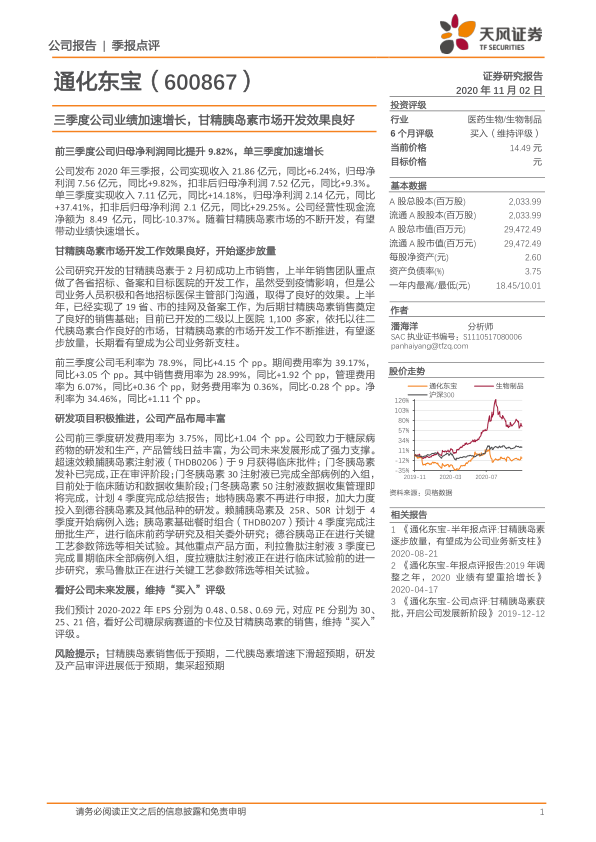 本报告分析了通化东宝(600867)2020年三季度业绩,指出公司业绩加速增长,主要得益于甘精胰岛素市场的良好开发。