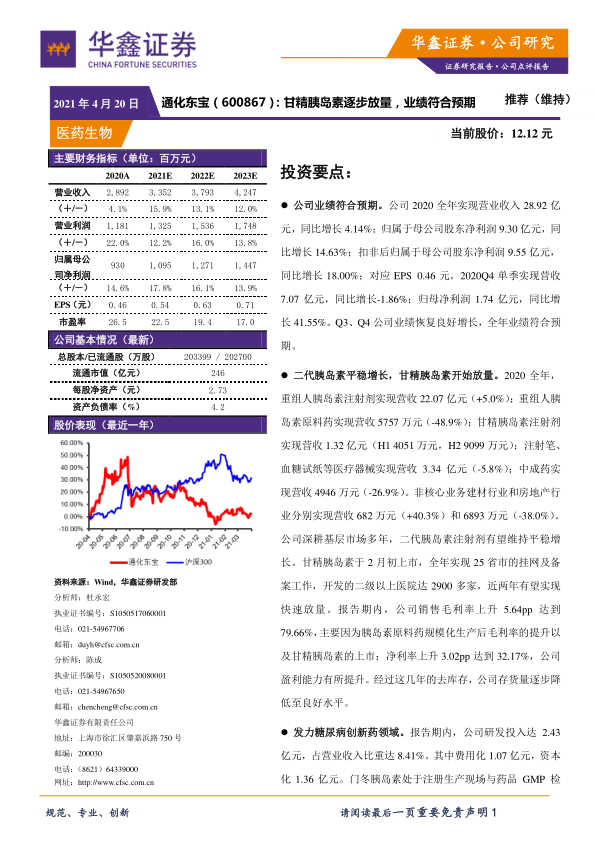 华鑫证券对通化东宝的未来业绩持乐观态度,预测公司2021年至2023年归属于母公司净利润将分别达到10.95亿元、12.71亿元和14.47亿元,对应每股收益(EPS)分别为0.54元、0.63元和0.71元。基于当前股价,对应的市盈率(PE)分别为22.5倍、19.4倍和17.0倍。鉴于公司业绩增长符合预期、甘精胰岛素逐步放量以及在糖尿病创新药领域的积极布局,华鑫证券维持对通化东宝的“推荐”评级。同时,报告也提示了潜在风险,包括胰岛素销售可能不达预期以及研发项目进展可能不达预期的风险。