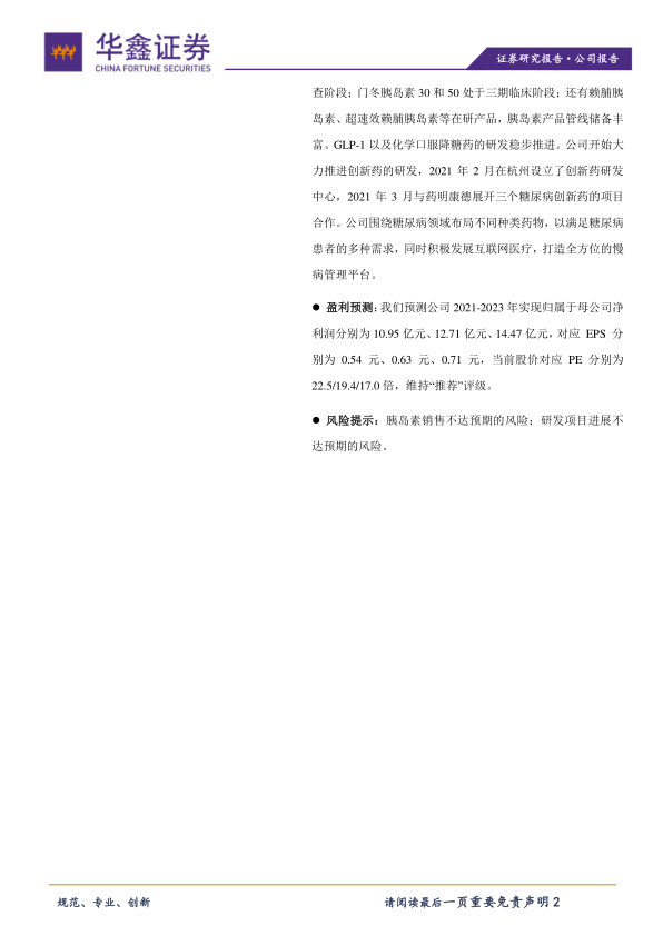 风险提示:胰岛素销售不达预期的风险;研发项目进展不达预期的风险。