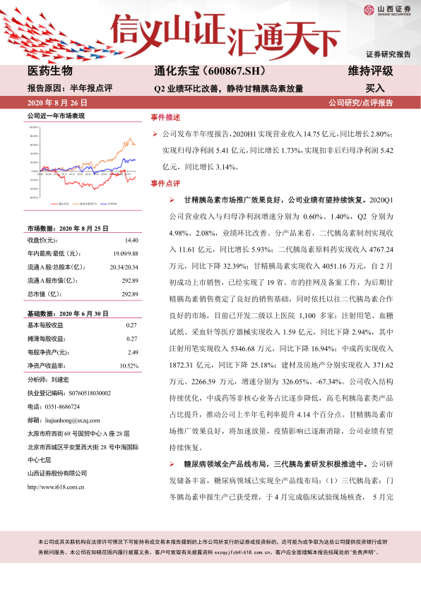 根据公司发布的半年度报告,通化东宝在2020年上半年实现营业收入14.75亿元,同比增长2.80%。同期,归属于母公司股东的净利润为5.41亿元,同比增长1.73%;扣除非经常性损益后的归母净利润为5.42亿元,同比增长3.14%。值得注意的是,公司业绩呈现出显著的环比改善趋势:2020年第一季度,营业收入和归母净利润增速分别为0.60%和1.40%,而第二季度则分别提升至4.98%和2.08%,表明疫情影响逐渐减弱,公司经营活动逐步恢复。