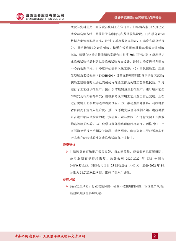 尽管公司在市场推广和研发方面取得了积极进展,但仍需关注药品安全、行业政策变化、研发成果不及预期、市场竞争加剧以及疫情可能带来的不确定性风险。综合来看,鉴于甘精胰岛素的良好市场前景和公司在糖尿病领域的深厚布局,分析师维持“买入”评级,并预计公司未来几年将保持良好的盈利增长态势,预计2020-2022年EPS分别为0.46元、0.53元和0.63元,对应PE分别为31.2倍、27.0倍和22.9倍。