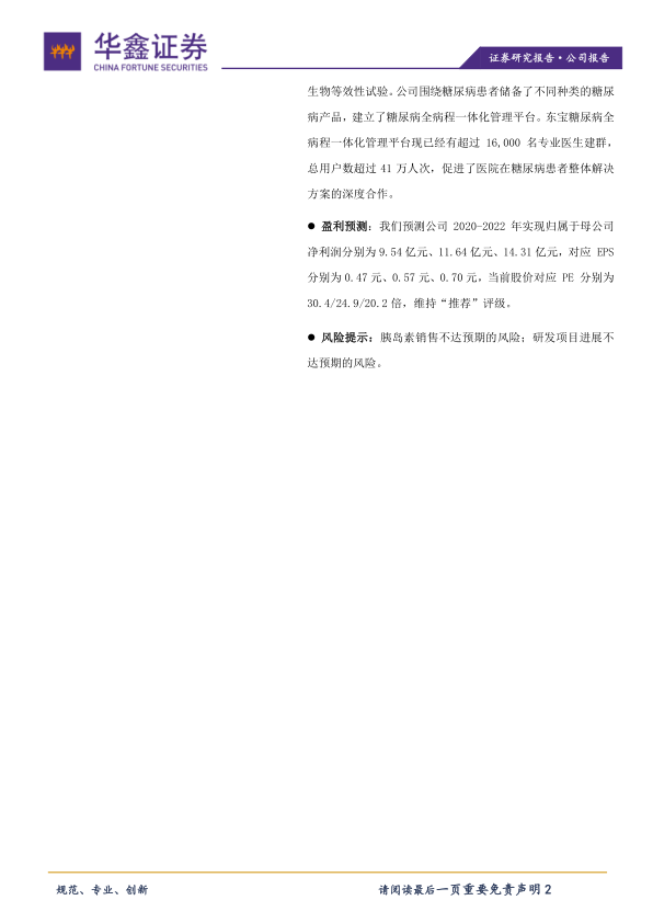 本报告对通化东宝(600867)2020年半年度业绩进行了分析,认为公司业绩符合预期,二代胰岛素业务保持稳定增长,三代甘精胰岛素有望快速放量。公司持续加大研发投入,糖尿病产品线储备丰富,并建立了糖尿病全病程一体化管理平台。维持公司“推荐”评级,但需关注胰岛素销售和研发项目进展等风险。