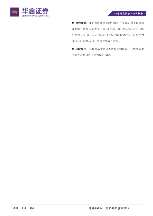 本报告分析了通化东宝2019年前三季度的业绩表现,指出公司业绩略低于预期,但胰岛素业务增速回升,展现出增长潜力。同时,报告强调了甘精胰岛素上市在即,公司糖尿病用药产品线不断丰富,未来可期。报告维持“推荐”评级,并提示了二代胰岛素销售不达预期以及三代胰岛素等研发项目进展不达预期的风险。