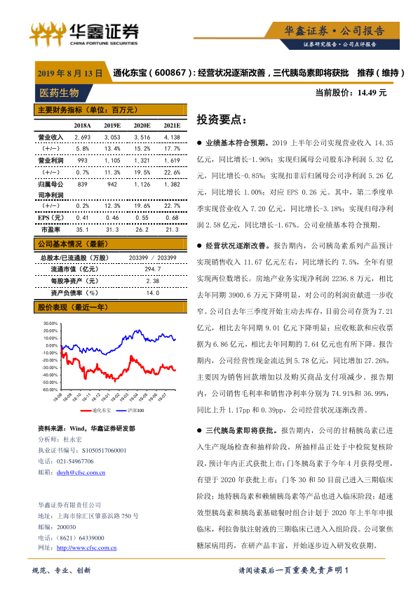 通化东宝2019年上半年业绩基本符合预期,经营状况逐渐改善,三代胰岛素即将获批上市,公司聚焦糖尿病用药,在研产品丰富,未来发展可期。维持“推荐”评级,但需关注二代胰岛素销售和三代胰岛素研发进展的风险。