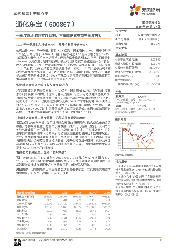 本报告对通化东宝2019年第一季度业绩进行了专业分析。尽管当季营收和归母净利润同比略有下降,但公司经营净现金流实现超预期大幅增长,同比增长130.96%,显示出卓越的经营质量和资金管理能力。胰岛素核心业务保持稳健增长,并通过持续的渠道去库存有效改善了应收账款周转效率。展望未来,公司业绩有望在2018年低点后实现快速反弹,主要驱动力将是二代胰岛素的稳定销售以及甘精胰岛素在第三季度获批上市所带来的新增量。公司丰富的研发管线,包括门冬胰岛素、利拉鲁肽等创新产品以及与Adocia合作的四代胰岛素,正逐步进入收获期,为公司长期发展注入强劲动力。鉴于公司在糖尿病领域的战略布局和创新能力,报告维持“买入”评级,并提示了新产品上市及销售不及预期等潜在风险。