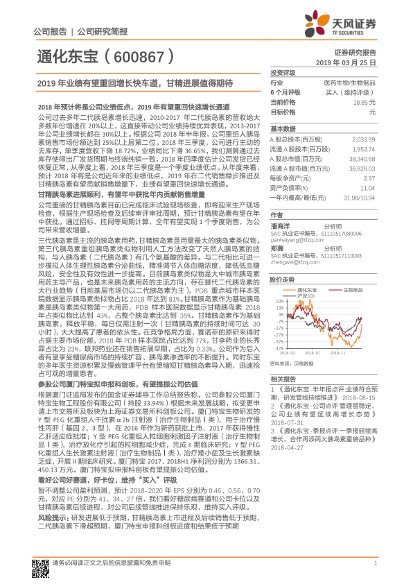 通化东宝在经历2018年的业绩低点后,凭借其在二代胰岛素市场的稳健表现和重磅产品甘精胰岛素的即将上市,预计2019年将迎来业绩的快速增长。甘精胰岛素作为市场主流的三代胰岛素类似物,其获批将为公司带来显著的销售增量和市场份额提升。此外,参股公司厦门特宝拟申报科创板,有望进一步提升通化东宝的整体估值。公司在糖尿病治疗领域的深厚积累和创新产品布局,为其未来的持续发展奠定了坚实基础,尽管仍需关注研发、销售及科创板申报等潜在风险。