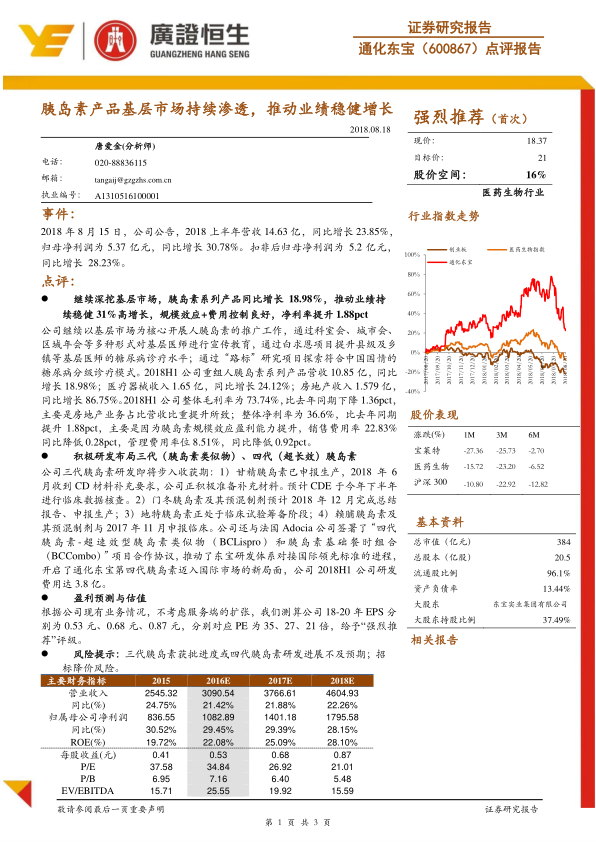 通化东宝在2018年上半年展现出强劲的业绩增长势头,这主要得益于其重组人胰岛素产品在基层市场的成功渗透和精细化推广策略。公司通过有效的费用控制和规模效应,实现了净利率的显著提升。同时,公司在第三代胰岛素的研发上取得了实质性进展,多个产品即将进入收获期,并积极通过国际合作布局第四代胰岛素,为未来的持续增长注入了强大动力。尽管面临新产品获批进度和招标降价等风险,但鉴于其稳健的现有业务表现和前瞻性的研发布局,分析师给予“强烈推荐”评级,认为公司具备良好的投资价值和增长潜力。