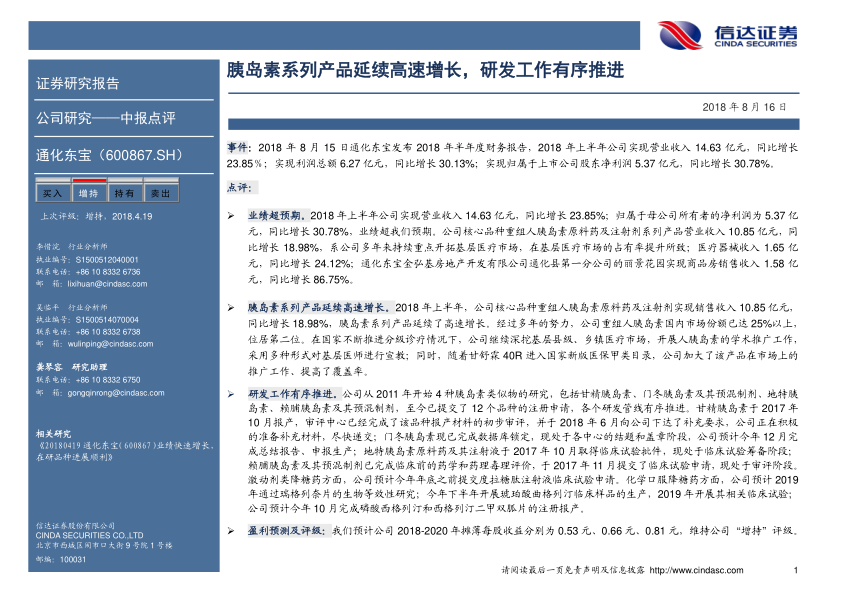 通化东宝2018年上半年业绩超出预期,营业收入和净利润均实现显著增长。核心产品胰岛素系列产品销售额持续增长,市场份额稳居国内第二,基层市场渗透率不断提高。