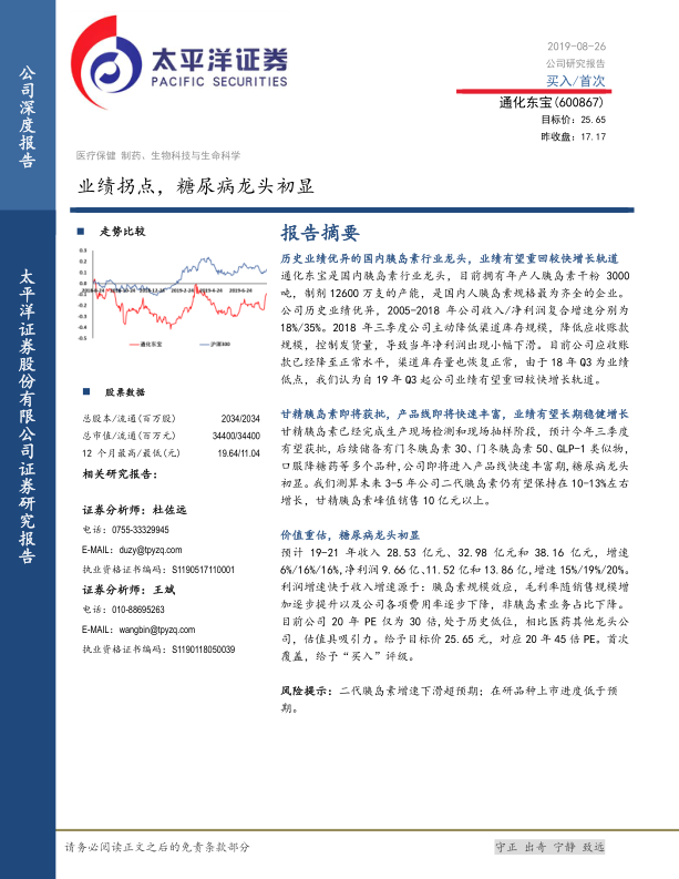 报告认为,随着渠道库存恢复正常和新品上市,公司业绩将迎来增长。预计2019-2021年,公司营业收入将分别达到28.53亿元、32.98亿元和38.16亿元,增速分别为6%、16%和16%。同期归母净利润预计为9.66亿元、11.52亿元和13.86亿元,增速分别为15%、19%和20%。利润增速快于收入增速,主要得益于胰岛素规模效应带来的毛利率提升以及各项费用率的逐步下降。目前,公司2020年PE估值仅为30倍,处于历史低位,相比医药行业其他龙头公司具有较强的估值吸引力。报告给予通化东宝目标价25.65元,对应2020年45倍PE,并首次覆盖给予“买入”评级。