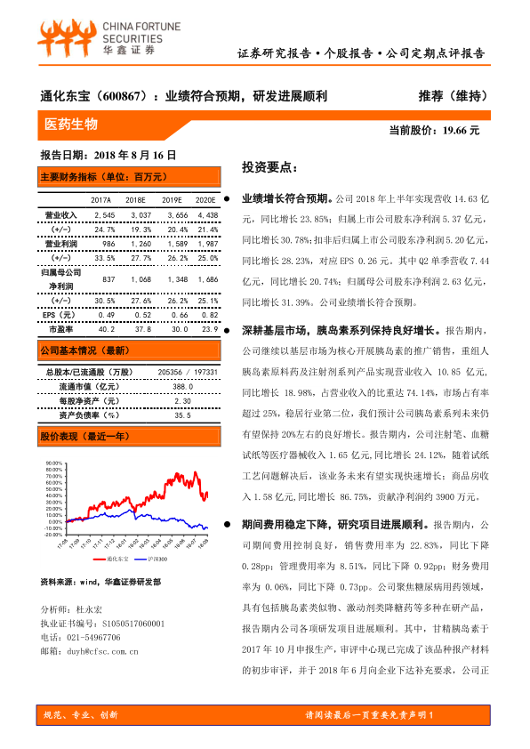 本报告的核心在于分析通化东宝2018年上半年的业绩表现,并对其未来的增长潜力进行评估。报告指出,公司业绩增长符合预期,主要得益于其在基层市场的深耕和胰岛素系列产品的良好增长。