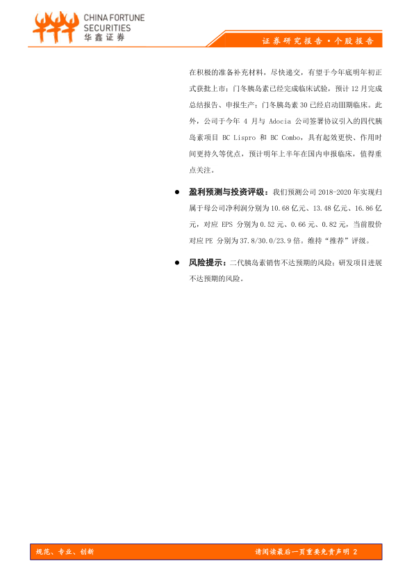 报告还关注了公司的研发进展,特别是在胰岛素类似物和新型降糖药方面的布局。基于这些因素,报告对公司未来的盈利能力进行了预测,并维持“推荐”评级,同时也提示了相关风险。