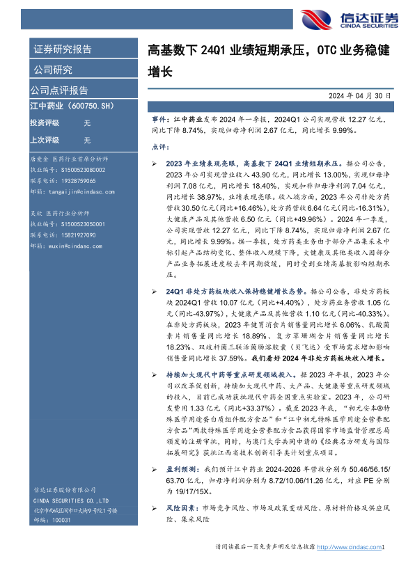 江中药业在2023年取得了亮眼的业绩增长,但在2024年第一季度,受高基数、处方药集采和部分大健康业务拓展放缓影响,整体营收短期承压。然而,公司核心的非处方药业务保持稳健增长,展现出较强的市场韧性。同时,公司持续加大研发投入,推动现代中药和创新产品发展,为长期增长奠定基础。尽管面临多重风险,分析师对公司未来几年的营收和利润增长持乐观态度。