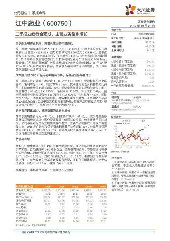 本报告对江中药业的三季报进行了详细分析,公司业绩符合预期,增长主要源于低基数效应。OTC产品毛利率略有下降,但保健品业务平稳增长,酒类业务快速增长。销售费用同比减少,管理费用略有增长。考虑到公司主业稳健、股权投资布局以及国企改革预期,维持“买入”评级,目标价44.10元。投资者应关注市场震荡风险以及公司业绩不及预期的风险。