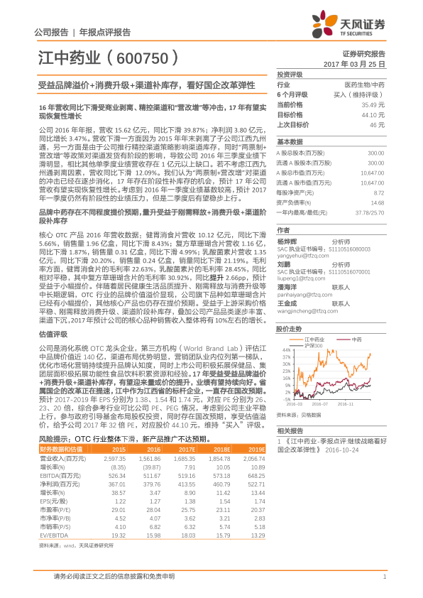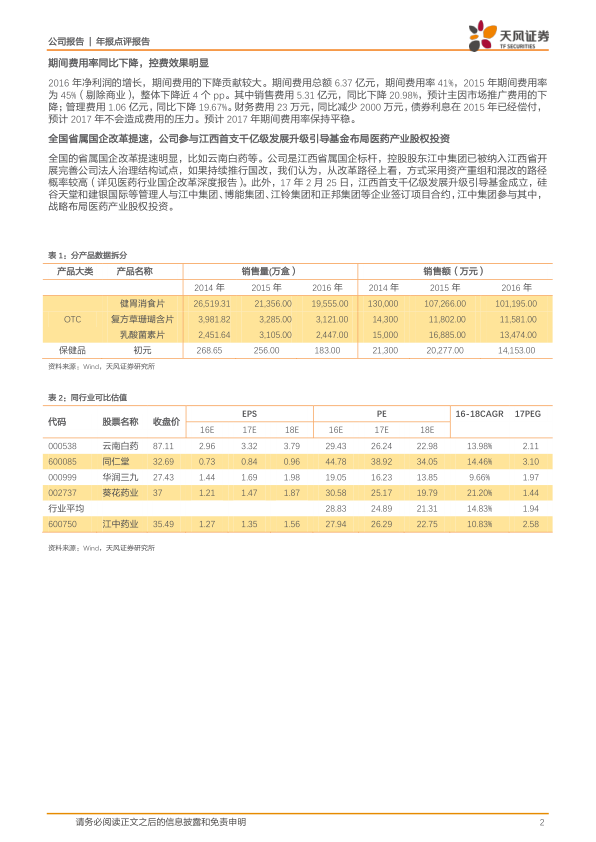 江中药业在2016年经历了营收下滑的挑战,主要受商业剥离、渠道策略调整及政策影响,但通过有效的费用控制实现了净利润的增长。展望2017年,公司有望受益于渠道补库存、消费升级以及核心品牌中药的提价预期,实现营收的恢复性增长,核心品种销售收入预计增长10%。作为消化系统OTC领域的领导者,江中药业拥有强大的品牌价值和市场营销能力,并积极拓展保健品等新业务。此外,公司作为江西省属国企改革的标杆,其改革预期和参与省级产业引导基金的战略布局,为公司带来了额外的估值溢价和长期发展潜力。基于对公司业绩增长、品牌优势和国企改革预期的综合判断,报告维持“买入”评级。