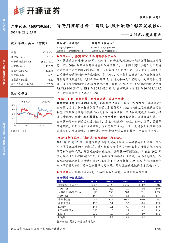 自2019年华润医药战略重组江中集团后,江中药业正式成为“华润系”一员,拥有稳定的央企背景和清晰的股权结构,这有助于公司高效整合资源并增强市场竞争力。公司积极响应国资委市值管理要求,通过连续多年超100%的现金分红比例和不断提高的股息率,有效回报了投资者,彰显了其稳健的财务状况和高质量发展的信心。此外,公司推出的股权激励计划,设定了明确且具有挑战性的业绩考核目标,旨在激发管理层和核心员工的积极性,为企业长期向好发展注入内生动力。基于对公司业务发展前景和财务表现的分析,预计江中药业2024-2026年归母净利润将持续增长,具备显著的投资价值。
