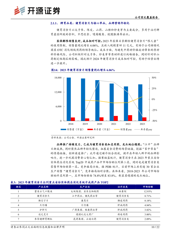 非处方药业务为公司的基本盘,主要围绕“脾胃、肠道、咽喉咳喘、补益维矿”四大核心品类,重点打造健胃消食片、乳酸菌素片、双歧杆菌三联活菌肠溶胶囊和复方草珊瑚含片等耳熟能详的大单品,并围绕核心单品拓展建设产品梯队,促进业绩稳增。同时,公司持续加深“内生外延”的增长逻辑,通过桑海制药、济生制药和海斯制药发力处方药业务,覆盖心脑血管、呼吸、妇科、泌尿、胃肠等治疗领域,并开拓老年慢病市场,探索营销新模式。此外,大健康业务聚焦挖掘高端滋补、康复营养、胃肠健康、肝健康四大核心业务潜力,丰富业务布局。