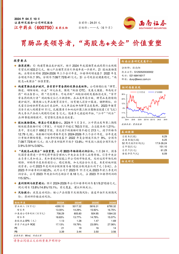 作为一家具有央国企背景的制药企业,江中药业通过实施股权激励计划,明确了未来三年的业绩考核目标,充分彰显了公司管理层对未来发展的信心。此外,公司持续维持高比例现金分红,2023年度分红比例高达归母净利润的115.52%,积极响应国资委关于市值管理纳入央企负责人业绩考核的导向,致力于提升股东回报,推动公司估值重塑,进一步增强市场吸引力。