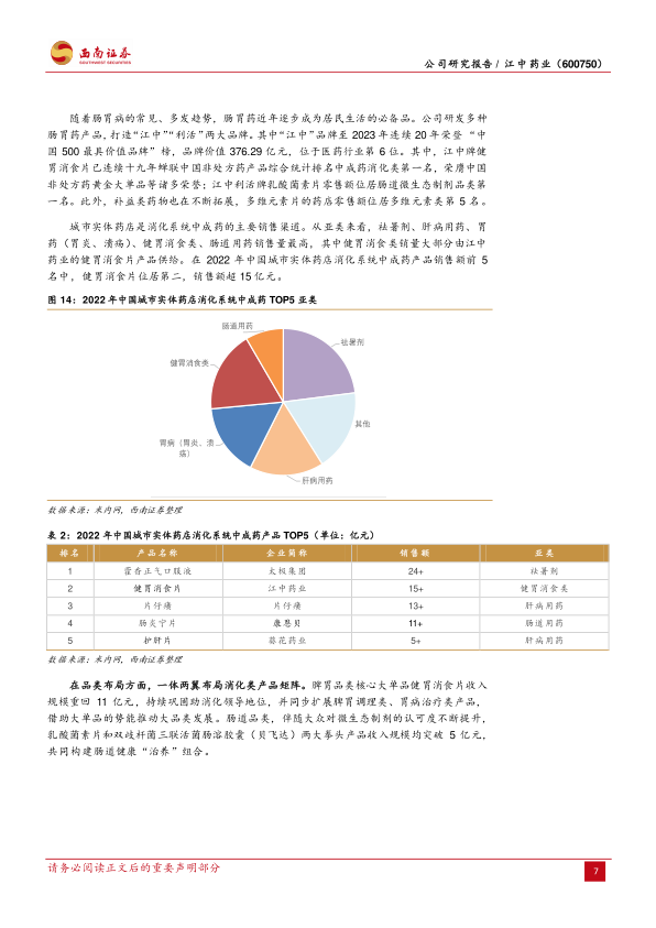 非处方药(OTC)是江中药业的主要盈利来源,其中肠胃药品类占据市场领导地位,需求旺盛且市场覆盖广泛。随着现代生活方式的改变和人口老龄化趋势加剧,肠胃疾病患者数量持续增长,推动了胃肠类OTC用药市场需求的上升。2019年中国肠胃疾病用药行业市场规模(按终端销售额统计)达到610亿元,预计2024年有望达到633.2亿元,年复合增长率约为0.75%。江中药业凭借“江中”和“利活”两大品牌,在这一市场中表现突出。“江中”品牌连续20年荣登“中国500最具价值品牌”榜,2023年品牌价值达376.29亿元,位居医药行业第6位。核心产品健胃消食片连续19年蝉联中国非处方药产品综合统计排名中成药消化类第一名,并荣膺中国非处方药黄金大单品。乳酸菌素片零售额位居肠道微生态制剂品类第一名。城市实体药店是消化系统中成药的主要销售渠道,在2022年中国城市实体药店消化系统中成药产品销售额前5名中,健胃消食片位居第二,销售额超过15亿元,其销量大部分由江中药业供给。