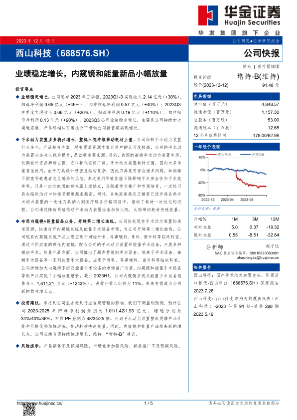 本报告对西山科技2023年三季报进行了深入分析,认为公司业绩保持稳定增长,手术动力装置业务稳步发展,内窥镜和能量新品业务有望成为新的增长点。尽管面临行业合规管理的影响,但公司凭借产品优势和多元化布局,未来发展前景可期,维持“增持-B”评级。投资者应关注报告中提示的风险,谨慎决策。