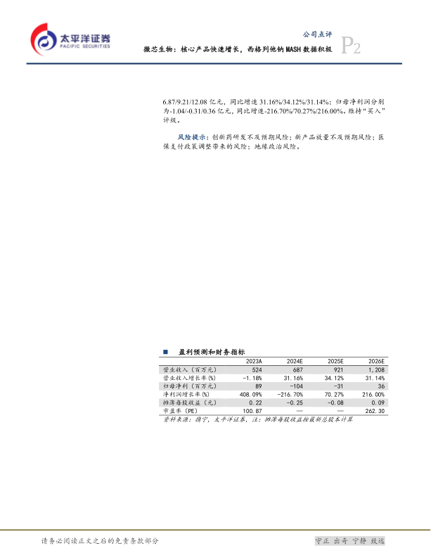 展望未来,公司预计将保持高速营收增长,并有望在2026年实现扭亏为盈,归母净利润预计达到0.36亿元。太平洋证券维持“买入”评级,肯定了公司的长期投资价值。然而,投资者仍需关注创新药研发、新产品放量、医保政策调整及地缘政治等潜在风险,以全面评估投资决策。