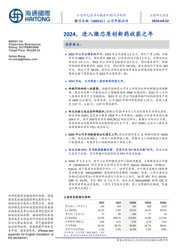 2024年公司多项数据读出及递交上市。西达本胺弥漫大B、西格列他钠NASH二期、西达本胺+PD-1一线非小细胞肺癌二期、西奥罗尼小细胞肺癌三期预计数据读出,西奥罗尼小细胞肺癌预计申请上市。