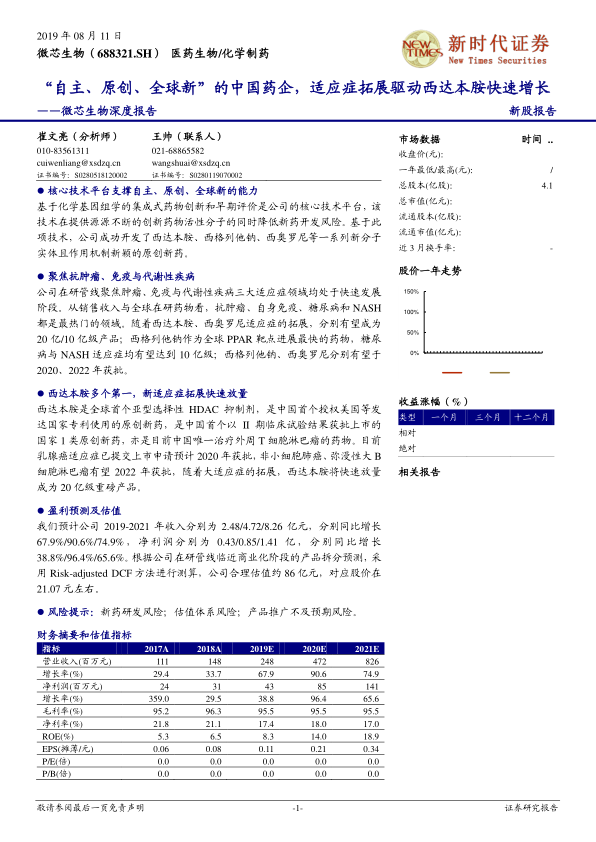 根据对公司核心产品销售收入的拆分预测,报告预计微芯生物2019-2021年收入将分别达到2.48亿元、4.72亿元和8.26亿元,同比增长67.9%、90.6%和74.9%。同期净利润预计分别为0.43亿元、0.85亿元和1.41亿元,同比增长38.8%、96.4%和65.6%。采用Risk-adjusted DCF方法进行测算,公司合理估值约86亿元,对应股价在21.07元左右。