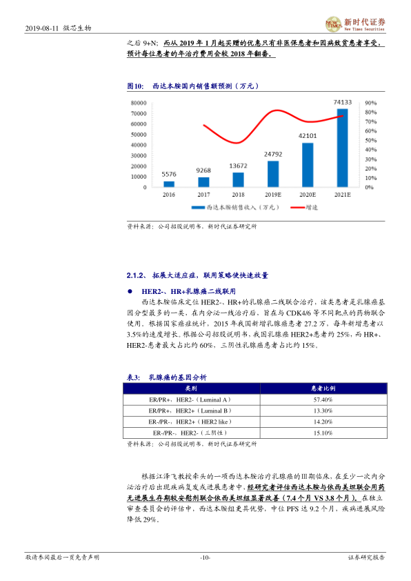 PTCL独家治疗药物,渗透率持续提升 根据国家癌症中心数据,2014年我国淋巴瘤发病率为5.94/10万,其中PTCL约占非霍奇金淋巴瘤的25%~30%,每年新增患者约1.31-1.57万人。西达本胺用于复发或难治性PTCL患者,推荐剂量为每次30mg,每周两次。2017年医保谈判后,西达本胺价格从550元/片降至385元/片,月治疗费用约1.85万元。与国外同类药物相比,西达本胺在疗效上表现最佳(总生存期中位数21.4个月,是同类药物的两倍),且口服顺应性好,价格更具优势。2018年,西达本胺销售44.64万片,用药PTCL患者约1000人,渗透率约10%。随着2019年医保赠药政策调整,患者平均费用大幅提升,PTCL适应症销售额有望从2018年的1.37亿元增长到2019年的2.43亿元,同比增长77%,并在渗透率快速提升的驱动下继续保持快速增长。