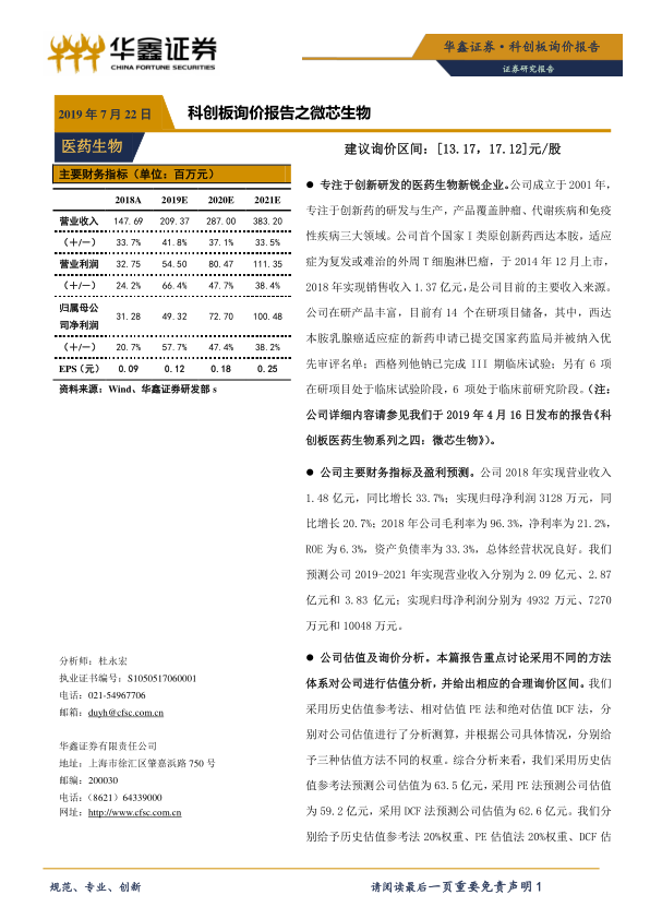 本报告对微芯生物的投资价值进行了全面分析,通过历史估值参考法、相对估值PE法和绝对估值DCF法,结合公司具体情况,给出了合理的询价区间。