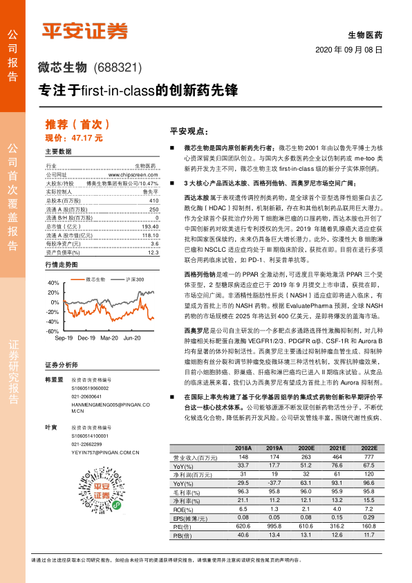 西达本胺作为全球首个亚型选择性组蛋白去乙酰化酶(HDAC)抑制剂,在获批外周T细胞淋巴瘤和乳腺癌适应症后,未来有望通过新适应症的不断落地和联合用药的巨大潜力,成长为销售峰值超20亿元的重磅炸弹。西格列他钠作为全球首个PPAR全激动剂,其2型糖尿病适应症即将上市,非酒精性脂肪性肝炎(NASH)适应症也具备成为首批上市药物的潜力,市场空间巨大。西奥罗尼作为机制新颖的多靶点激酶抑制剂,在多个肿瘤适应症中展现出良好前景。公司特有的化学基因组学技术平台是其保持高效创新的核心竞争力,能够源源不断地发现创新药物活性分子,并显著降低新药开发风险,为公司未来持续发展提供强大动力。基于对三大主力品种的估值,报告首次覆盖给予“推荐”评级,并认为公司200亿市值仅是起点,未来发展空间广阔。