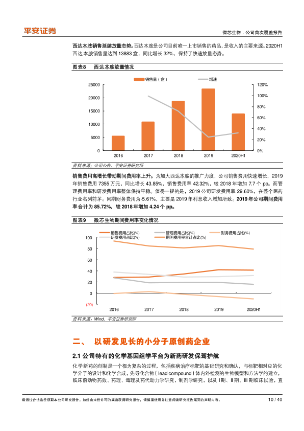 微芯生物的业绩保持快速增长态势。2015-2019年,公司营业收入和归母净利润的复合年均增长率(CAGR)分别达到39.83%和37.84%。2020年上半年,公司实现收入1.11亿元,同比增长35.00%,归母净利润2871万元,同比增长63.97%,在疫情影响下逆势大幅回升。西达本胺作为公司目前唯一上市销售的药品,是收入的主要来源,2020年上半年销售量达到13883盒,同比增长32%,保持了快速放量态势。公司在研发方面投入巨大,2019年研发费用率高达29.60%,在医药行业中名列前茅,显示出其以研发为核心的经营策略。同期销售费用也快速增长,2019年销售费用7355万元,同比增长43.85%,销售费用率达到42.32%,主要用于加大西达本胺的推广力度。