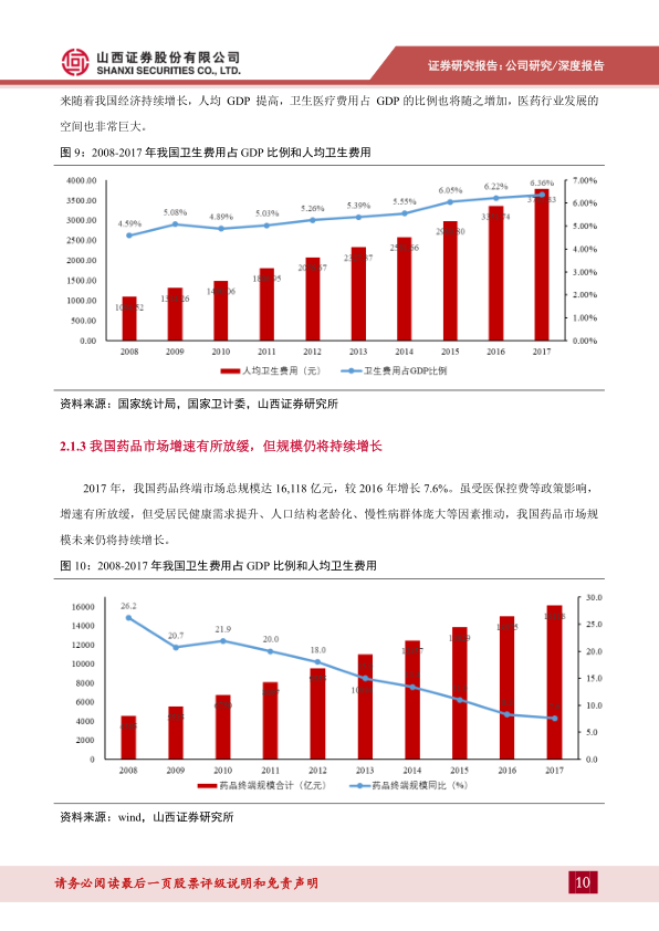 - 我国经济持续增长,卫生医疗费用逐年提高:2017年我国人均GDP为59,201元,全国卫生医药费用总额占GDP比重为6.36%。随着经济增长和居民健康意识增强,医药行业发展空间巨大。
