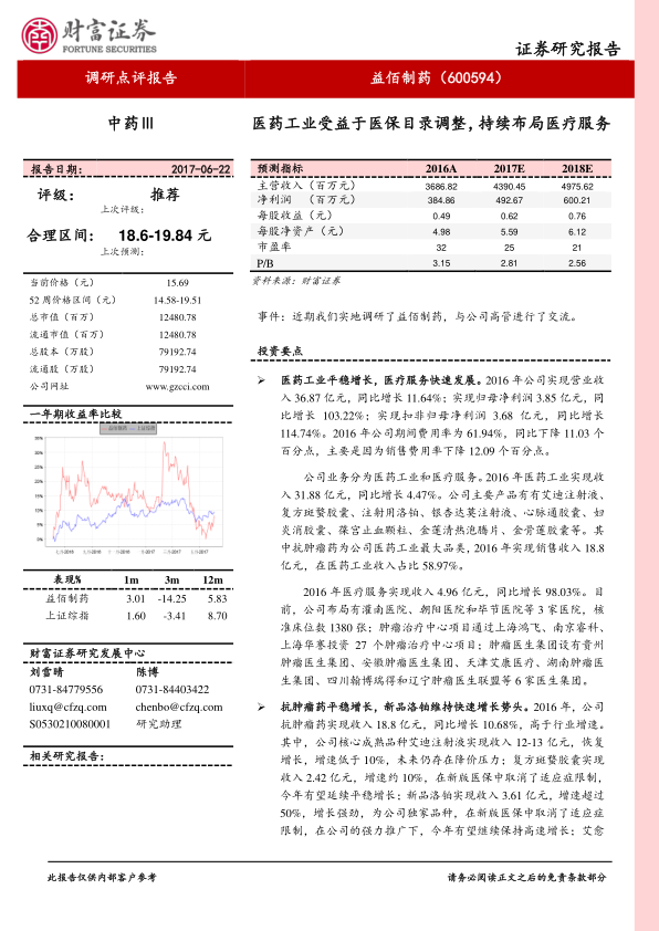 益佰制药受益于医保目录调整,医药工业板块中抗肿瘤药稳定增长,新品种洛铂快速放量,心脑血管和妇科用药后续品种有望接力。同时,公司积极布局医疗服务,通过“外延+内生”的方式实现快速扩张。报告预测了公司未来两年的EPS,并给予“推荐”评级,但同时也提示了药品招标降价和医疗服务业务外延不及预期的风险。