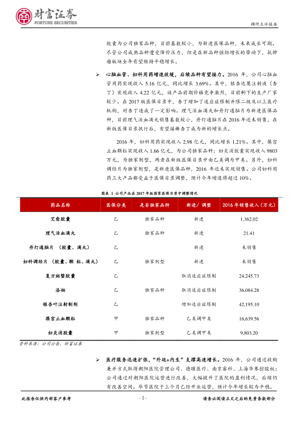 2016年公司营业收入和归母净利润均实现显著增长,期间费用率显著下降。公司业务主要分为医药工业和医疗服务两部分。医药工业方面,抗肿瘤药为公司最大品类。医疗服务方面,公司通过自建和收购兼并方式,积极布局医院和肿瘤治疗中心项目。