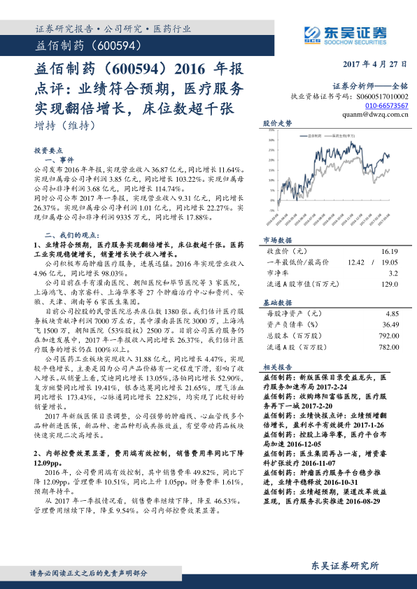 公司业绩符合预期,其中医疗服务板块表现尤为突出,2016年实现营业收入4.96亿元,同比增长98.03%,贡献净利润约7000万元。公司积极布局肿瘤医疗服务,目前拥有灌南医院、朝阳医院和毕节医院等3家医院,以及27个肿瘤治疗中心和6家医生集团,控股民营医院总床位数达到1380张。2017年一季报显示,医疗服务增长仍在100%以上。医药工业板块实现收入31.88亿元,同比增长4.47%,销量增长快于收入增长,如艾迪同比增长13.05%,洛铂同比增长52.90%,复方斑蝥同比增长19.41%,银杏达莫同比增长21.65%,理气活血同比增长173.43%,心脉通同比增长22.82%。