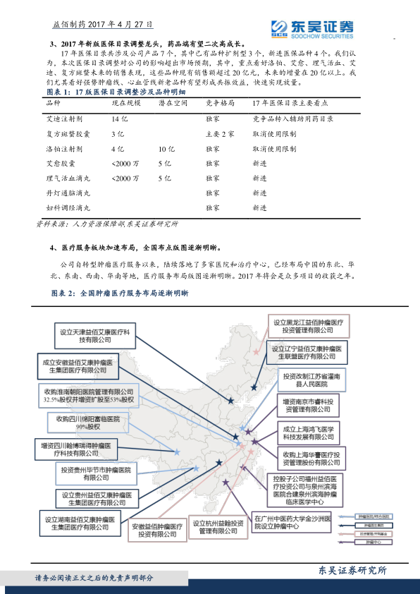 公司自转型肿瘤医疗服务以来,已陆续落地多家医院和治疗中心,布局范围覆盖中国的东北、华北、东南、西南、华南等地,医疗服务布局版图逐渐明晰。预计2017年将是众多项目的收获之年。
