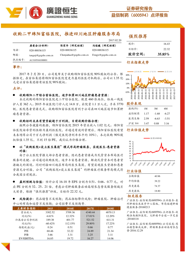 中心思想 收购医院,积累资源: 益佰制药收购绵阳富临医院90%股权,旨在逐步积累四川地区的肿瘤患者资源,为后续肿瘤服务布局奠定基础。 模式创新,对接资源: 公司通过“收购医院+设立医生集团”的模式,对接医生和患者资源,符合当前医疗服务发展趋势。 主要内容 事件概述 收购公告: 益佰制药发布公告,拟以1.35亿元收购绵阳富临医院90%股权,前提是富临集团将该医院变更为盈利性医疗机构。 点评 患者资源积累: 绵阳富临医院是一家二甲综合医院,拥有460张床位和362名医护人员,2015年门诊人次14.8万,出院量1.1万人次,手术3770例,患者资源充足。 收购该医院有利于公司在四川地区逐步积累肿瘤患者资源。 收购价格合理性: 绵阳富临医院2015年营业收入1.02亿元,转为盈利性医院后,预计未来有望增厚公司千万元净利润(假定净利率10%)。 本次收购90%股权估值1.35亿,不到15倍PE,认为价格合理。 肿瘤服务布局模式: 通过收购医院,逐步丰富患者资源,解决民营资本对患者资源缺乏的困境。 对接四川地区布局的医生集团,有望实现医生资源和患者资源充分对接。 “收购医院+设立医生集团”的肿瘤医疗服务布局模式符合我国当前现状。 盈利预测与估值: 预计公司16-18年EPS分别为0.51、0.66、0.77元,对应PE分别为32、25、21倍。 考虑公司肿瘤服务启动高增长态势及服务领域巨大前景,维持 “强烈推荐”评级,目标价22.32元。 风险提示: 药品销售不及预期;药品招标降价风险;肿瘤医院、肿瘤治疗中心的布局和运营不及预期;公司控费不及预期等。 主要财务指标 营业收入: 2015年33.03亿元,2016E 37.09亿元,2017E 43.40亿元,2018E 48.70亿元。 归属母公司净利润: 2015年1.89亿元,2016E 4.02亿元,2017E 5.22亿元,2018E 6.11亿元。 每股收益(元): 2015年0.24元,2016E 0.51元,2017E 0.66元,2018E 0.77元。 P/E: 2015年68.46,2016E 32.22,2017E 24.89,2018E 21.34。 总结 战略收购,完善布局: 益佰制药收购绵阳富临医院是其在四川地区肿瘤服务布局的重要一步,有助于积累患者资源。 模式创新,前景可期: “收购医院+设立医生集团”的模式有望实现医生和患者资源的有效对接,为公司肿瘤服务带来增长潜力。