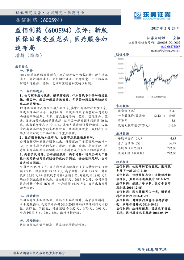 本报告分析了益佰制药在新版医保目录下的受益情况,以及公司在医疗服务领域的布局进展。医保目录的调整为公司药品销售带来新的增长点,尤其是在肿瘤和心血管领域。同时,公司在全国范围内积极拓展医疗服务,构建肿瘤治疗平台。高管的增持也显示了对公司未来发展的信心。综合来看,益佰制药未来发展动力强劲,维持增持评级,但也需关注医院业务拓展和药品招标降价的风险。