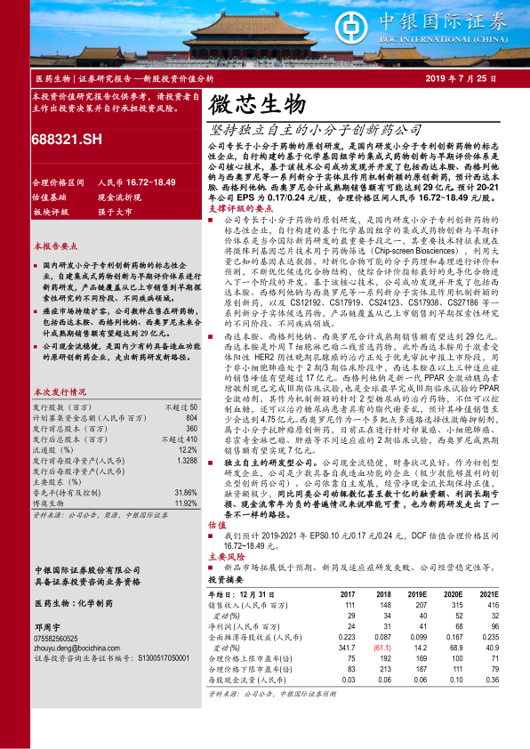 预计公司2019-2021年收入将分别达到2.05亿元、3.12亿元、4.12亿元,增速分别为40.0%、52.2%、32.2%。同期净利润预计分别为0.41亿元、0.68亿元、0.97亿元,增速分别为30.0%、68.9%和40.9%。毛利率将维持在96%以上,净利率逐步提升至23.2%。作为国内少数实现收入和净利润的原研创新药公司,微芯生物具备独立的研发实力和丰富的研发管线,登陆科创板后有望展现良好的投资价值。
