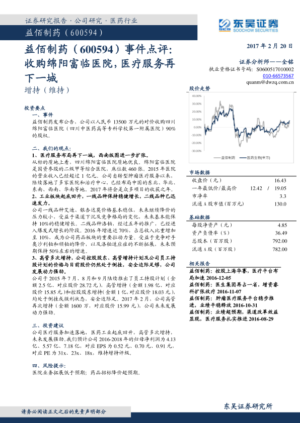益佰制药通过收购绵阳富临医院,进一步巩固了其在肿瘤医疗服务领域的战略布局和西南市场份额,预计2017年将迎来医疗服务项目的收获期。同时,公司医药工业板块表现出强劲的复苏势头,一线品种稳健增长,二线品种洛铂实现爆发式增长,成为业绩新引擎。管理层及控股股东的多次增持行为,以及员工持股计划,为公司提供了坚实的安全边际和发展信心。综合来看,公司未来发展动力强劲,预计净利润将持续增长,维持“增持”评级,但需警惕医院业务拓展不及预期及药品招标降价超预期的风险。