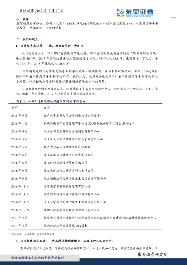 益佰制药此次收购的绵阳富临医院质地优良,该医院为国资参股的二级甲等综合医院,拥有460张床位。根据2015年数据,其营业收入已超过1亿元,门诊人次达14.8万,出院量1.1万人次,手术量3770例,住院收入7000万元。收购后,四川省中医药高等专科学校仍持有剩余10%股权,有助于发挥其人才优势,支持公司在肿瘤医疗服务领域的战略布局。公司自转型肿瘤医疗服务以来,已在中国东北、华北、东南、西南、华南等地陆续落地多家医院和治疗中心,2017年预计将是众多项目实现收益的关键一年。