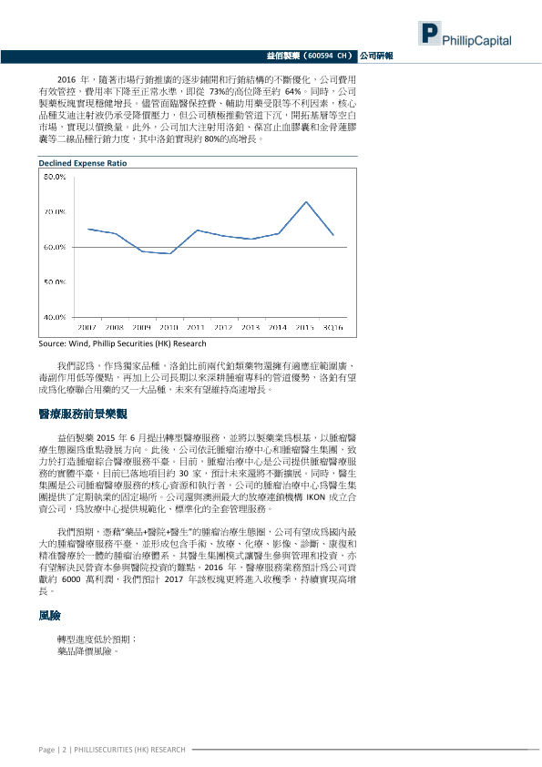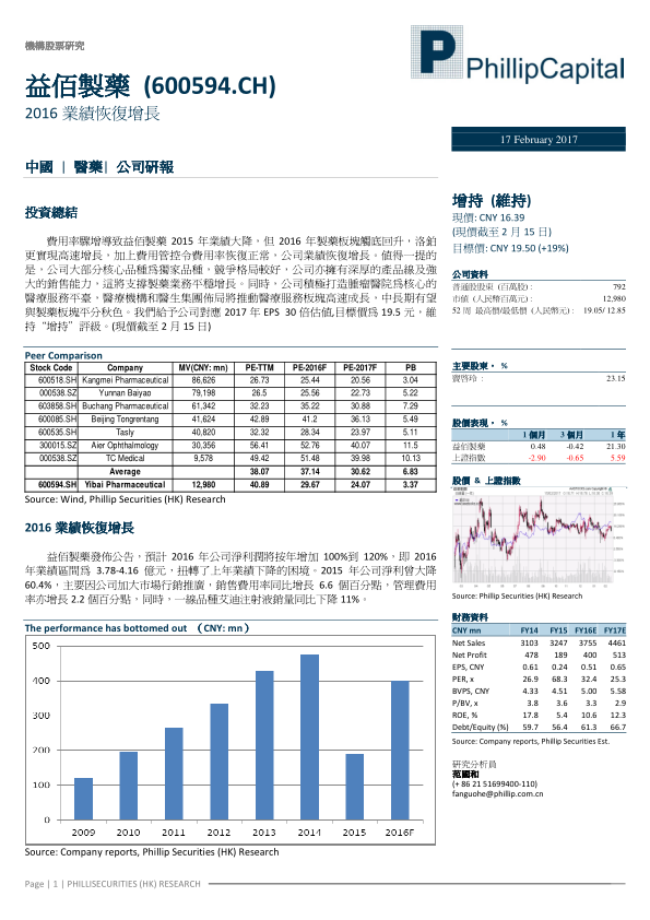 本报告认为,益佰制药在2016年业绩恢复增长,主要得益于制药板块的复苏和医疗服务业务的拓展。公司在肿瘤治疗领域具有较强的竞争优势,未来有望成为国内领先的肿瘤医疗服务平台。维持“增持”评级,目标价为19.5元。但同时也提示了转型进度低于预期和药品降价的风险。