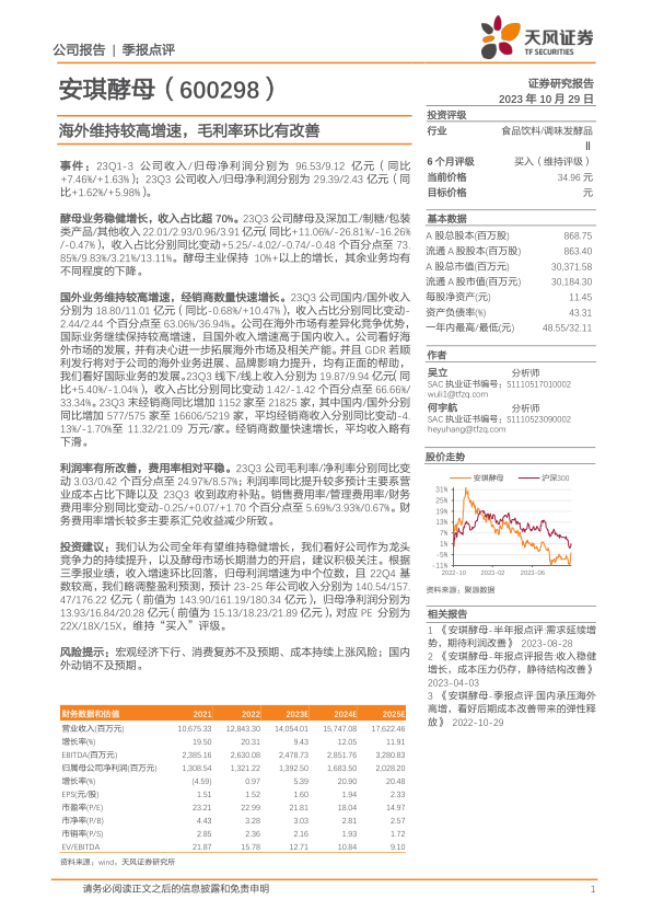本报告分析了安琪酵母2023年第三季度(23Q3)的业绩表现,并对公司未来发展前景进行了展望。核心观点如下: