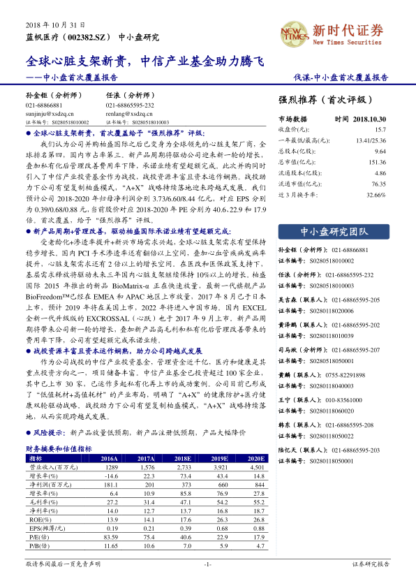 中小盘首次覆盖报告:全球心脏支架新贵,中信产业基金助力腾飞
