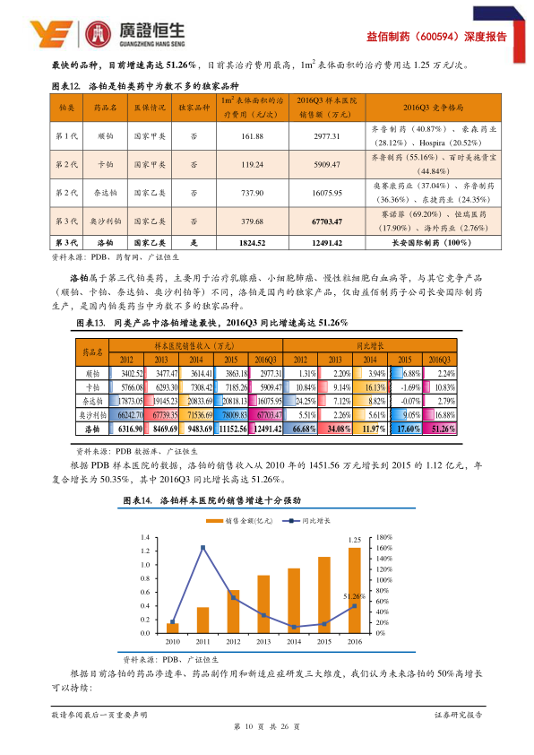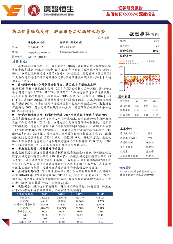 本报告核心观点指出,益佰制药在经历2015年的销售下滑后,自2016年第三季度起,其核心抗肿瘤药销售已逐步恢复增长,特别是独家品种洛铂展现出强劲的增长势头。同时,公司通过有效的费用控制,显著提升了净利润水平。更重要的是,益佰制药正积极构建一个涵盖肿瘤治疗(药品+放疗)、终端医院和医患资源(医生集团)的肿瘤医疗服务生态圈,该生态圈的盈利能力正逐步释放,有望成为公司未来业绩增长的主要驱动力。