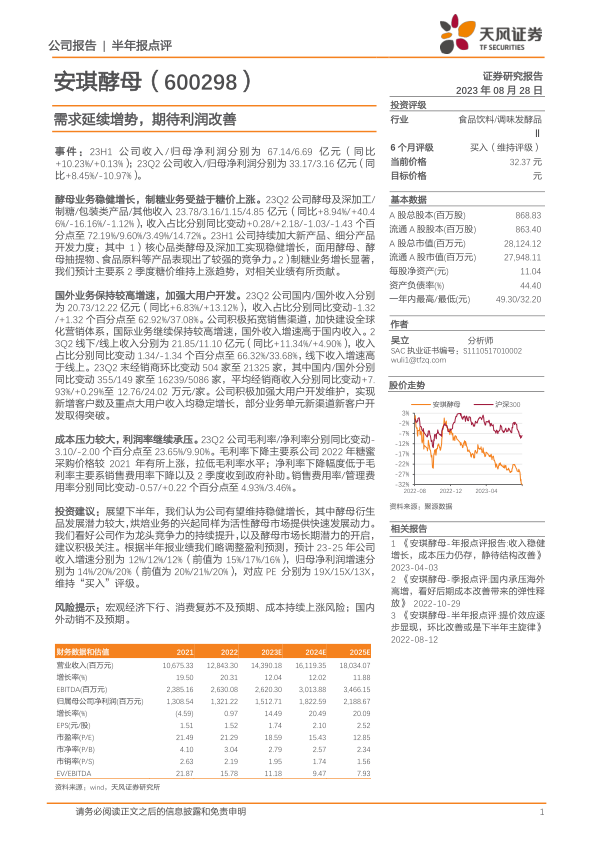 安琪酵母2023年上半年在需求端延续了增长势头,酵母业务稳健,制糖业务受益于糖价上涨,国外业务保持较高增速。但同时,公司也面临成本压力,导致利润率承压。展望下半年,公司有望维持稳健增长,酵母衍生品和烘焙业务具有较大发展潜力。维持“买入”评级,但需关注宏观经济下行、消费复苏不及预期、成本持续上涨以及国内外动销不及预期等风险。
