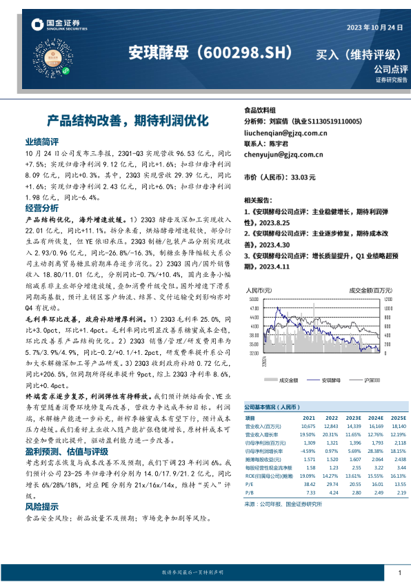 本报告对安琪酵母2023年三季报进行了简评,核心观点如下: